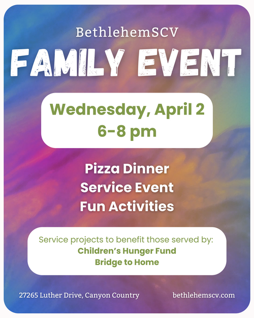 On April 2nd we will pause our Bible Classes and have a BethlehemSCV Family event where we will come together to assemble lunches for Bridge to Home and Children's Hunger Fund Food Paks.